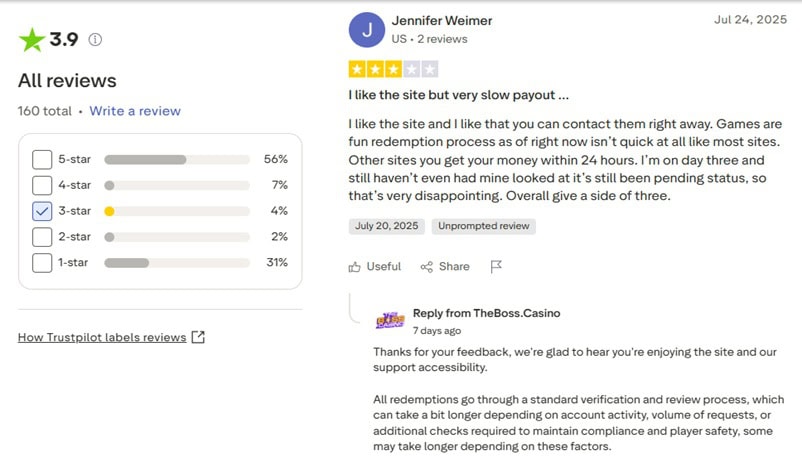 A look into Trustpilot’s TheBoss.Casino review reflects different opinions, mostly positive though, with a trust score of 3.9 out of 5.